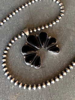 Black onyx set in fine and sterling silver. Sold as pendant only. Pictured with 6mm Navajo pearls that are sold separately