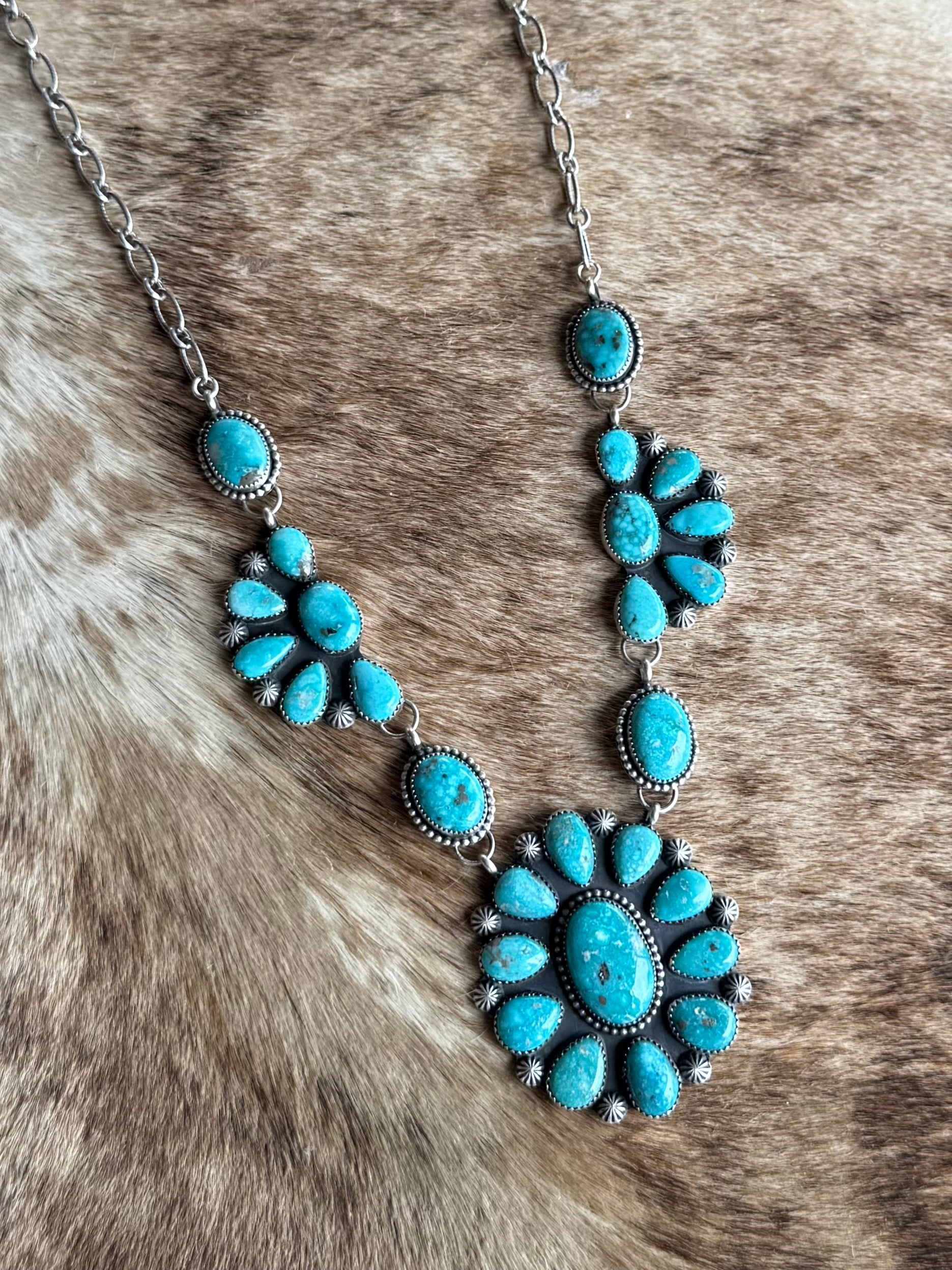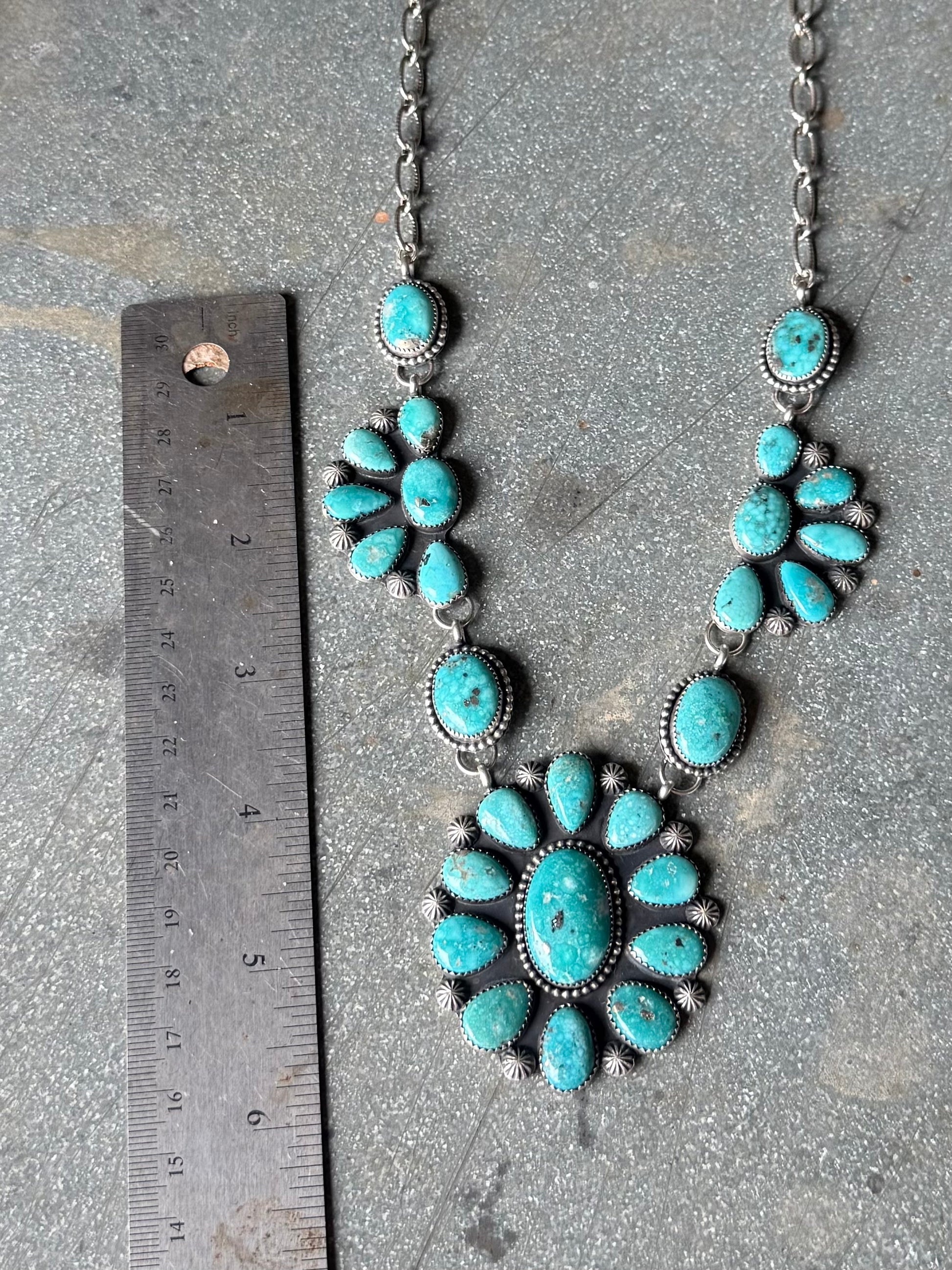 High grade white water turquoise set in fine and sterling silver. Comes on a 16” adjustable chain. See photos for size.