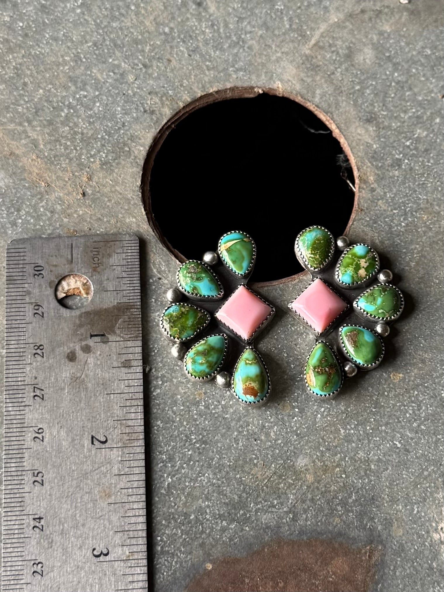 High grade sonoran mountain turquoise paired with pink conch shell set in fine and sterling silver. See photos for si...