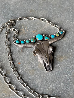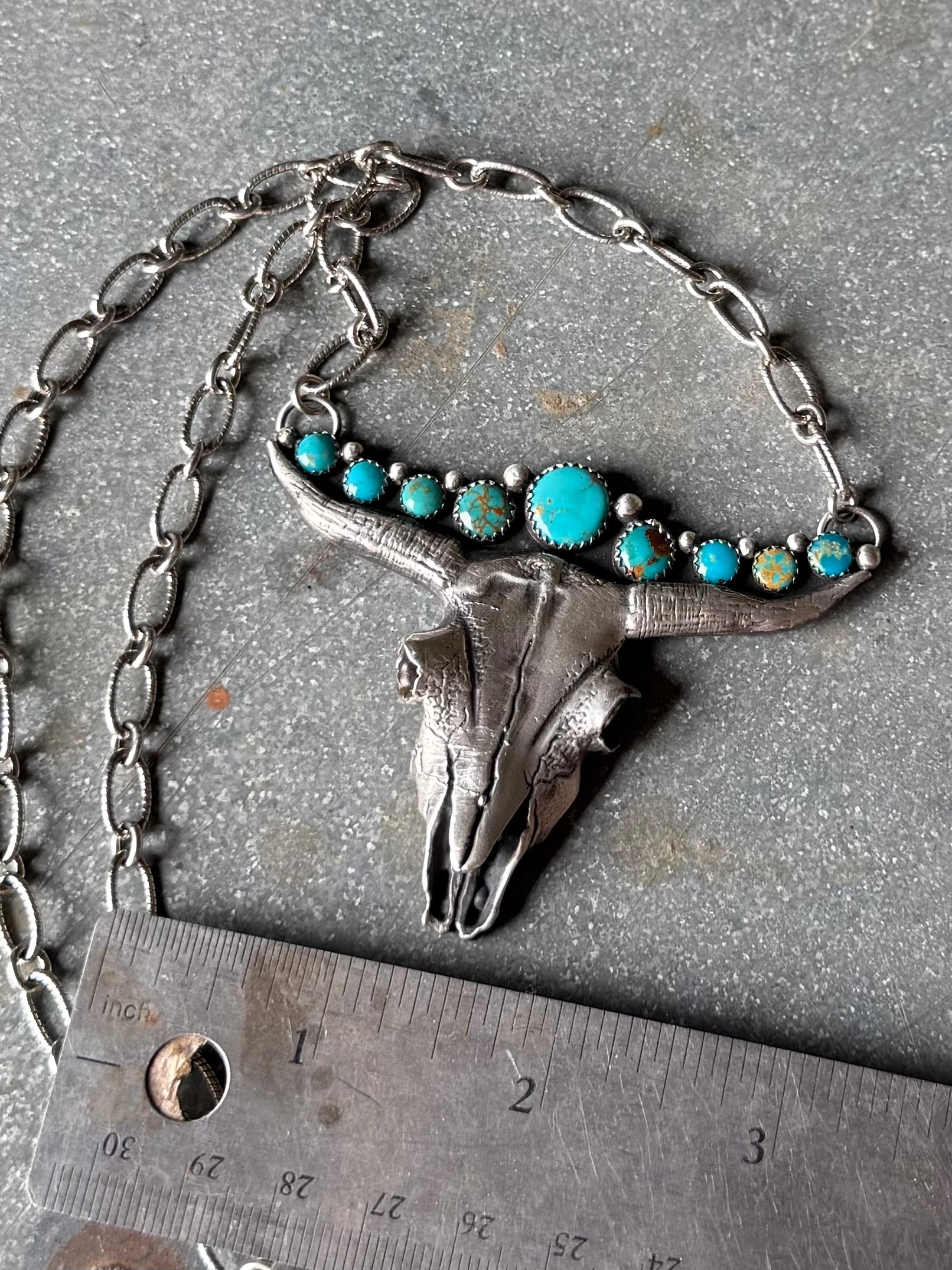 High grade kingman turquoise set in fine and sterling silver with a solid sterling silver skull. Comes on a sterling silver 18” chain. See photos for size.