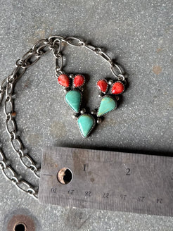 BAja turquoise and red spiny oyster shell set in fine and sterling silver. Comes on a sterling silver 18” chain. See photos for size.