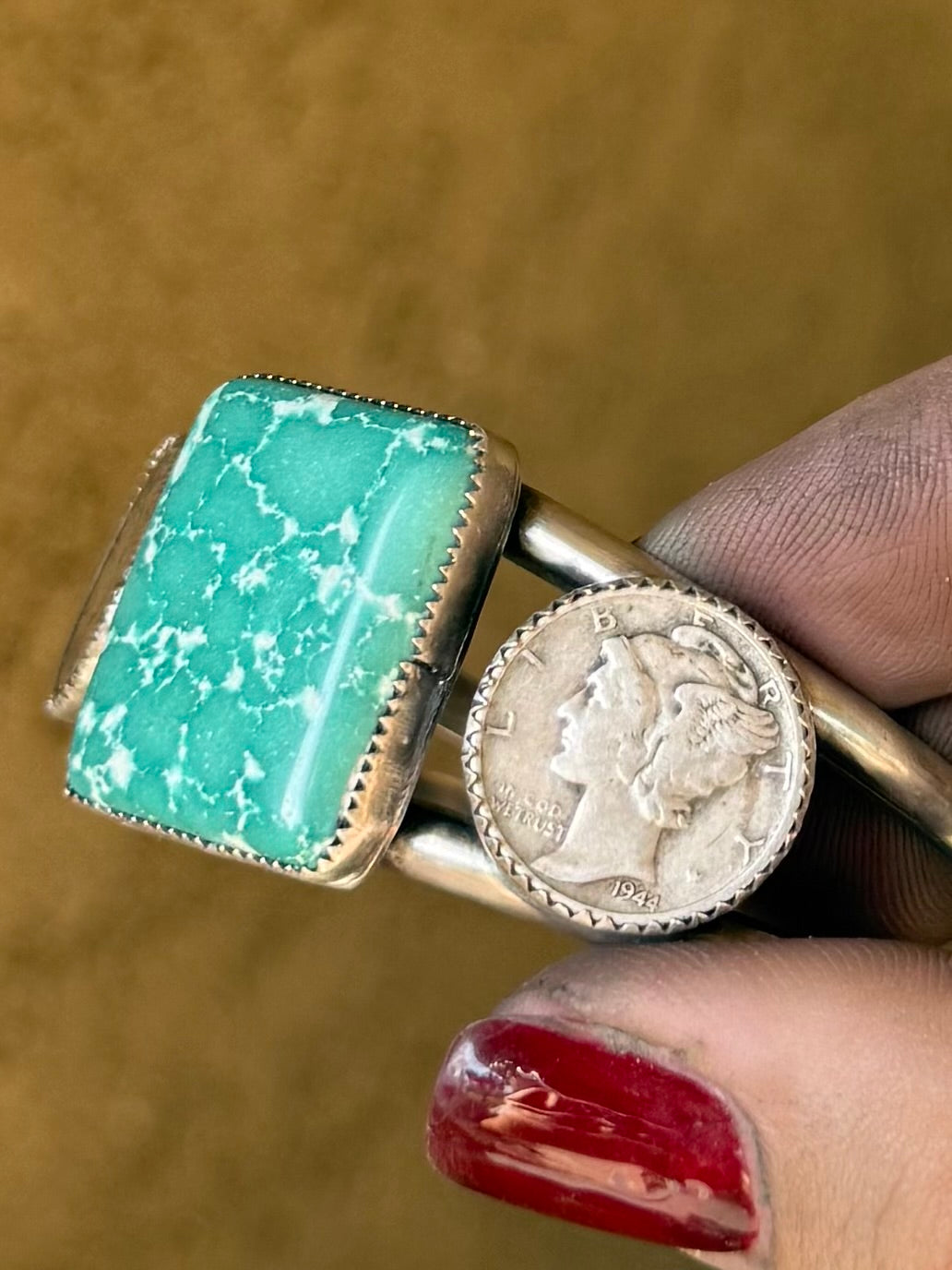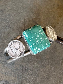 High grade white water turquoise paired with authentic liberty dimes all set in fine and sterling silver. Comes on a 5.25” sterling silver band not counting the gap. Made for a small wrist. See photos for size.