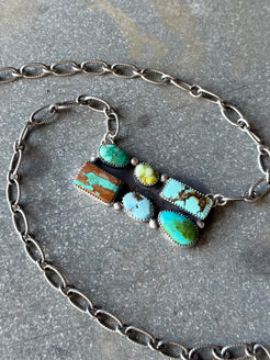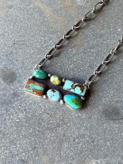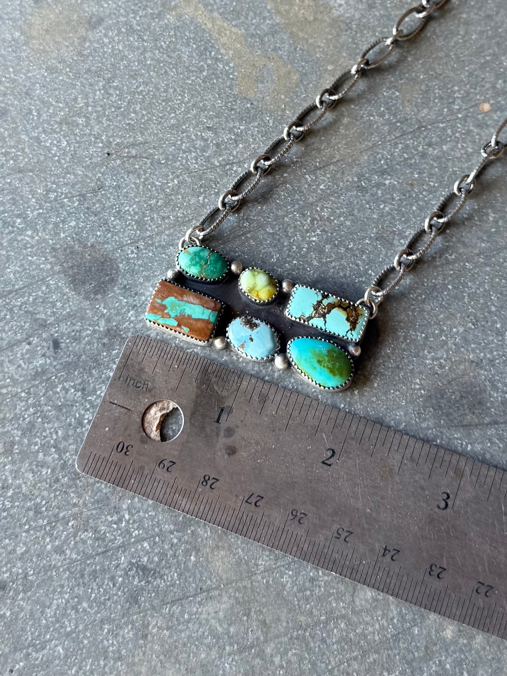 High grade royston ribbon, verde valley, Hubei, palomino varascite and golden hills turquoise set in fine and sterling silver on a sterling silver chain. See photos for size. Comes on an adjustable chain.