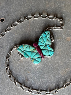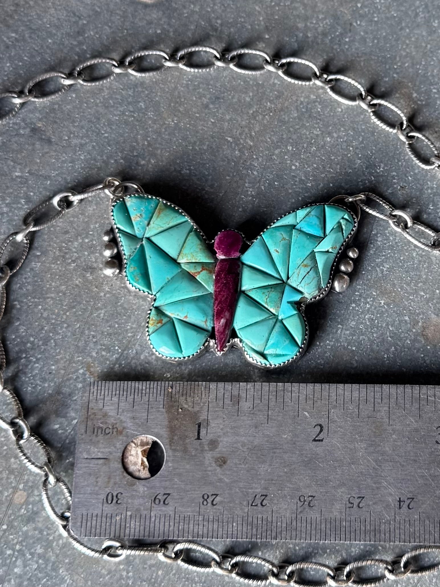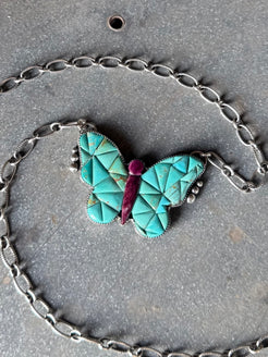 manmade Kingman turquoise and purple spiny oyster shell cobblestone set in sterling silver comes on an 18” sterling silver adjustable chain.