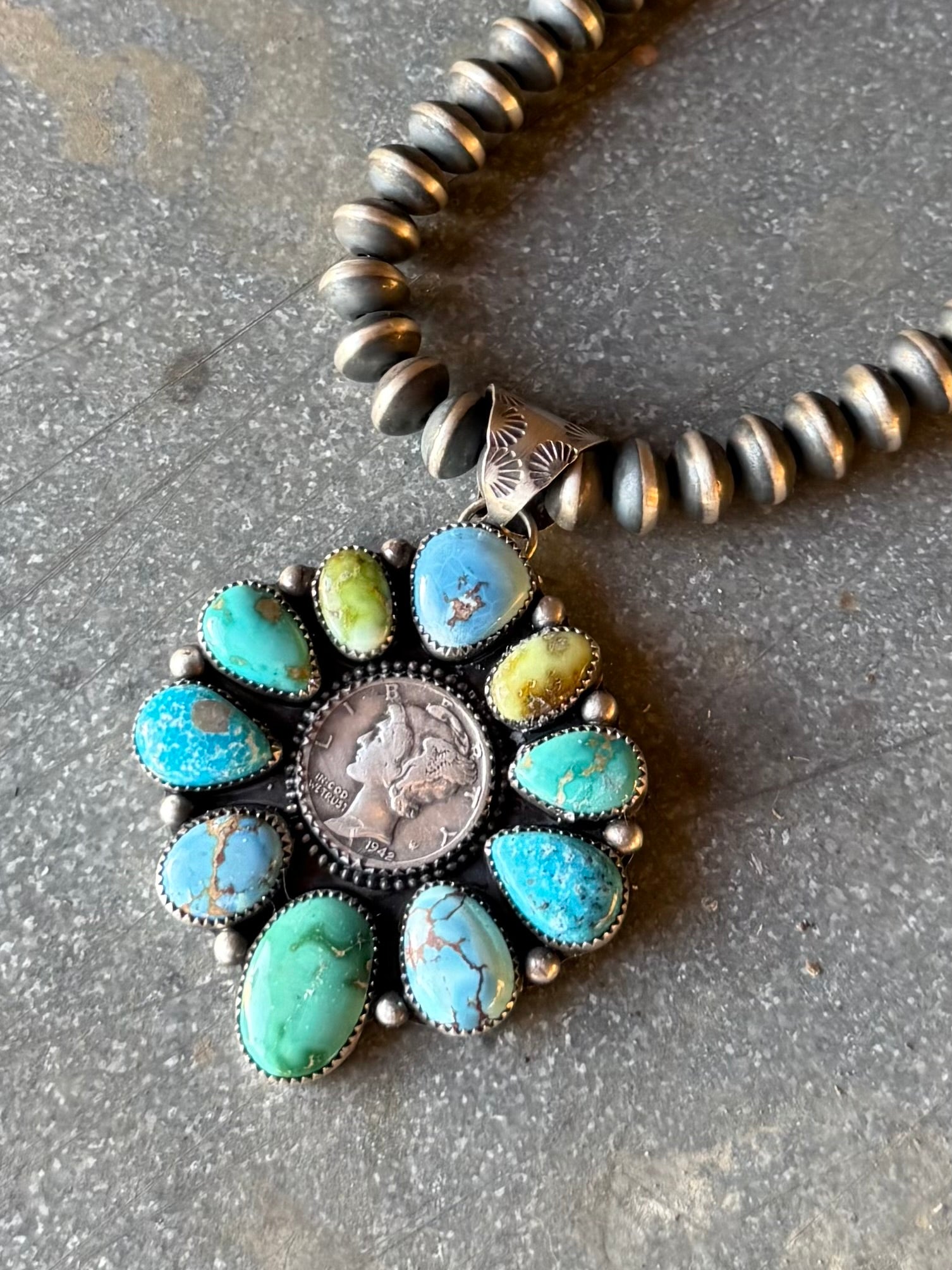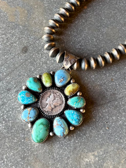 high grade emerald valley, golden hills turquoise, palomino varascite, bLue ridge turquoise. Sold as pendant only. See photos for size. Fits up to a 9mm bead. Pictured on our strand of 9mm saucer beads.