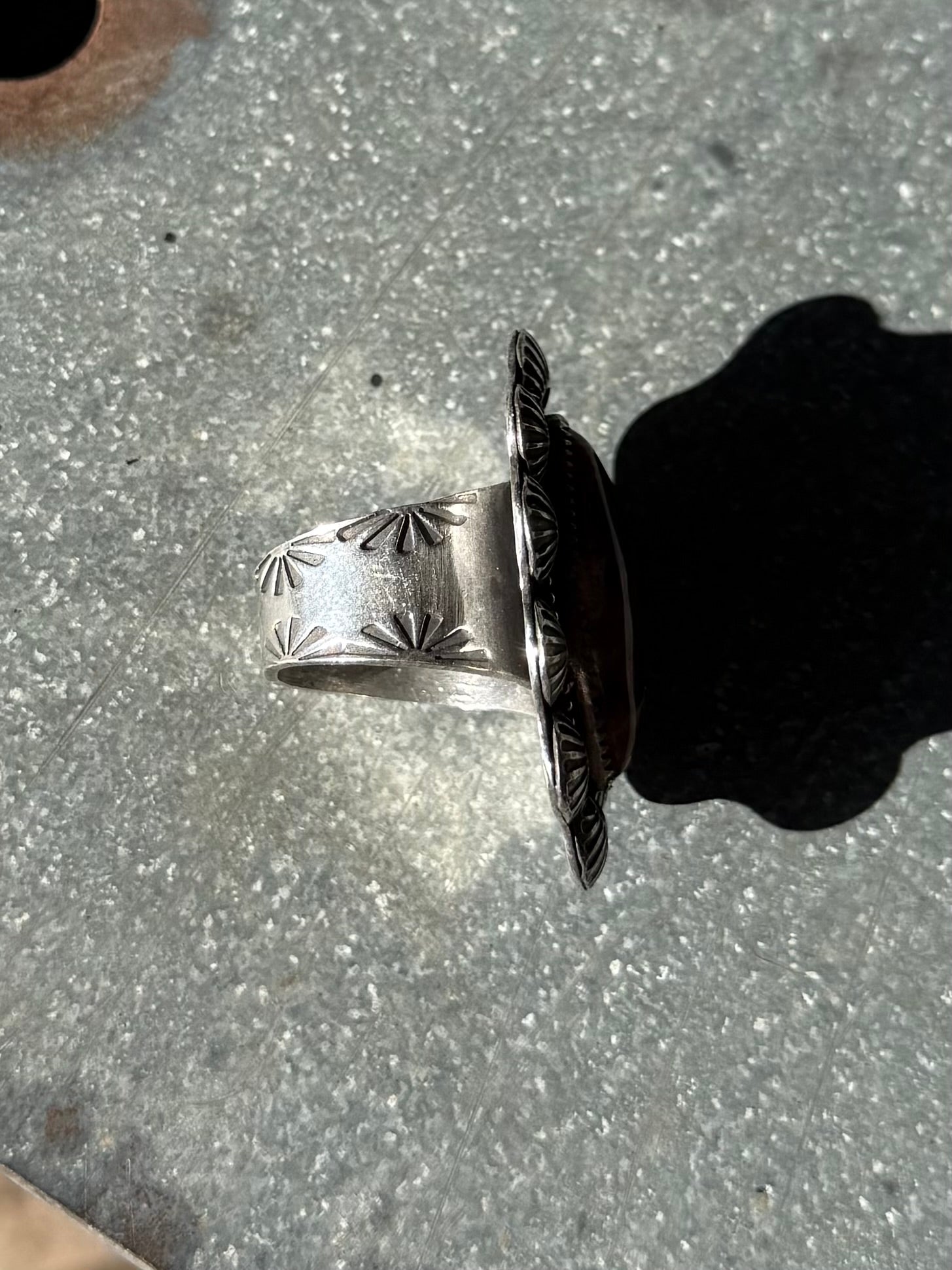 natural cantera fire opal set in fine and sterling silver set on a hand stamped sterling silver band. Size 9. Can’t be resized. See photos for size.