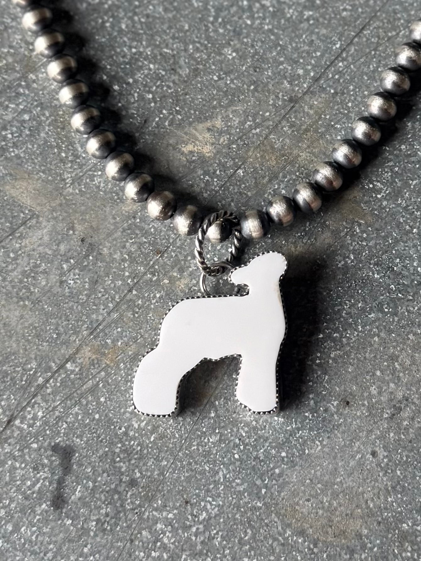 White magnesite stone set in Sterling silver. Sold as pendant only. Pictured on 6mm Navajo pearls. See photos for size.