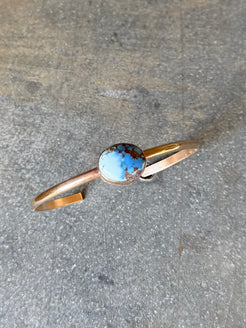 High grade golden hills turquoise set in 14/20 kt yellow gold bezel wire on a 5.5.” gold filled band. Band is adjustable. Backed in sterling silver.