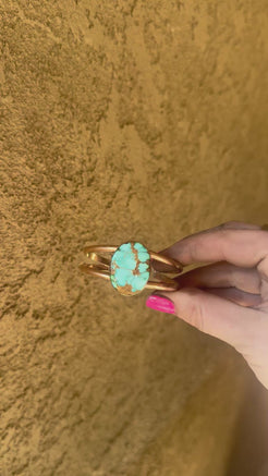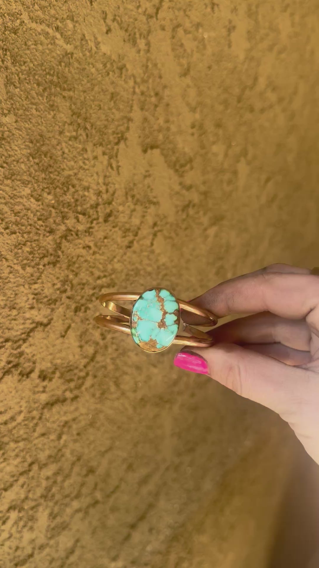 High grade sonoran turquoise set in 14/20kt yellow gold filled bezel with a sterling silver back. Set on 14/20kt yellow gold filled wire. Measures 5.5” with no gap included in that measurement. Adjustable.