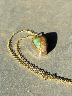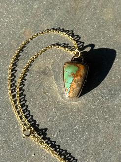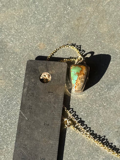 High grade royston turquoise set with a 14/20 kt yellow gold filled bezel on a sterling silver back. Comes on a dainty 16” 14/20 kt yellow gold chain. See photos for size.