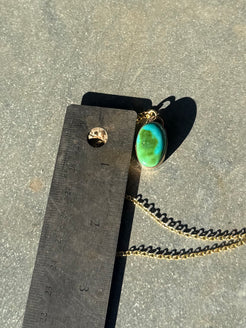 High grade sonoran mountain turquoise set with a 14/20 kt yellow gold filled bezel on a sterling silver back. Comes on a dainty 16” 14/20 kt yellow gold chain. See photos for size.