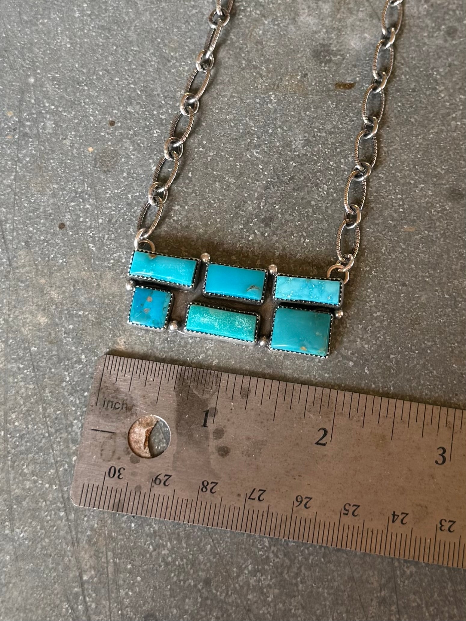 High grade kingman and royston set in fine and sterling silver on a sterling silver chain. See photos for size. Comes...