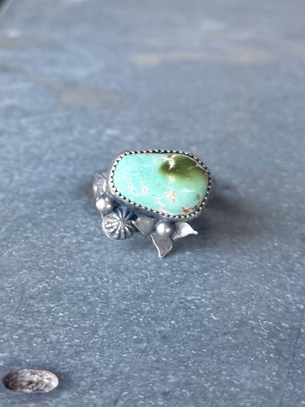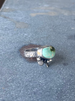 High grade royston turquoise set in fine and sterling silver with hand forged flower accents. Size 8. Can’t be resize...