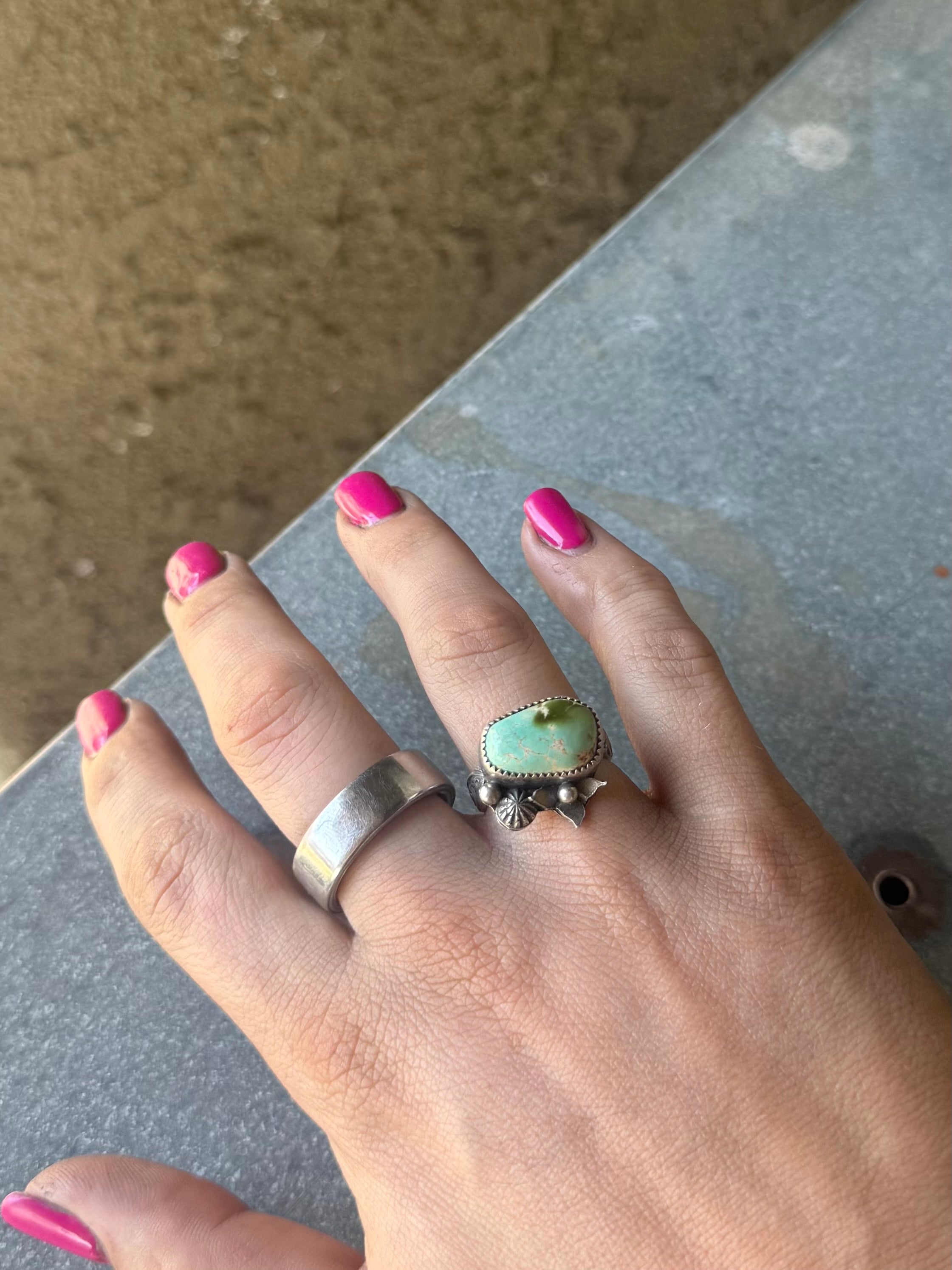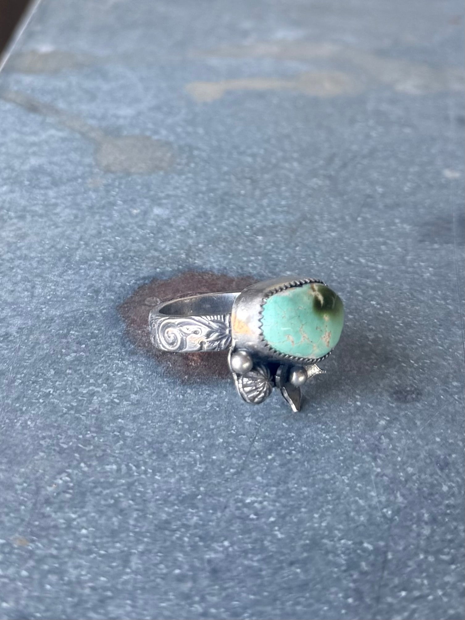 High grade royston turquoise set in fine and sterling silver with hand forged flower accents. Size 8. Can’t be resized. See photos for size on my hand.