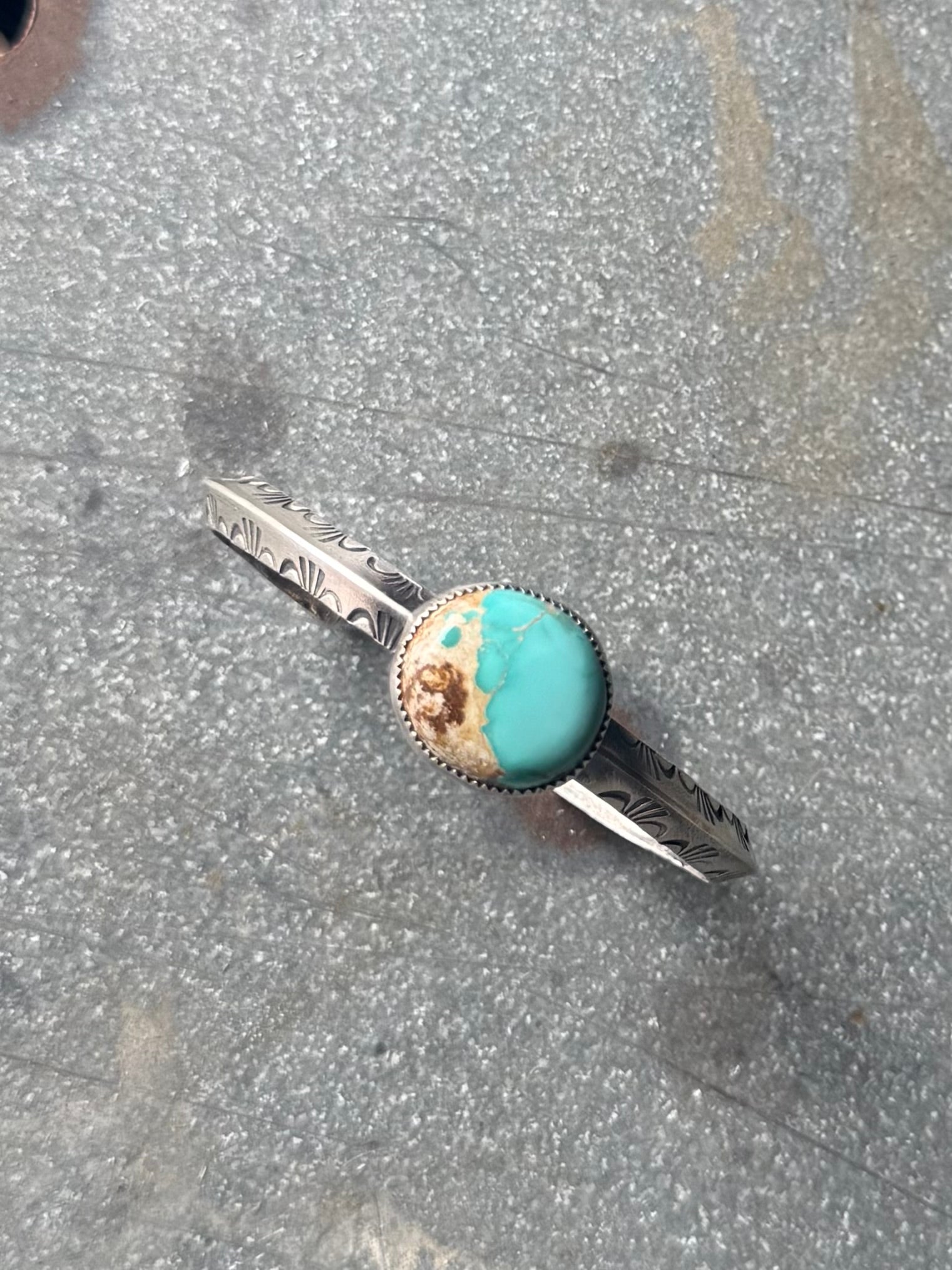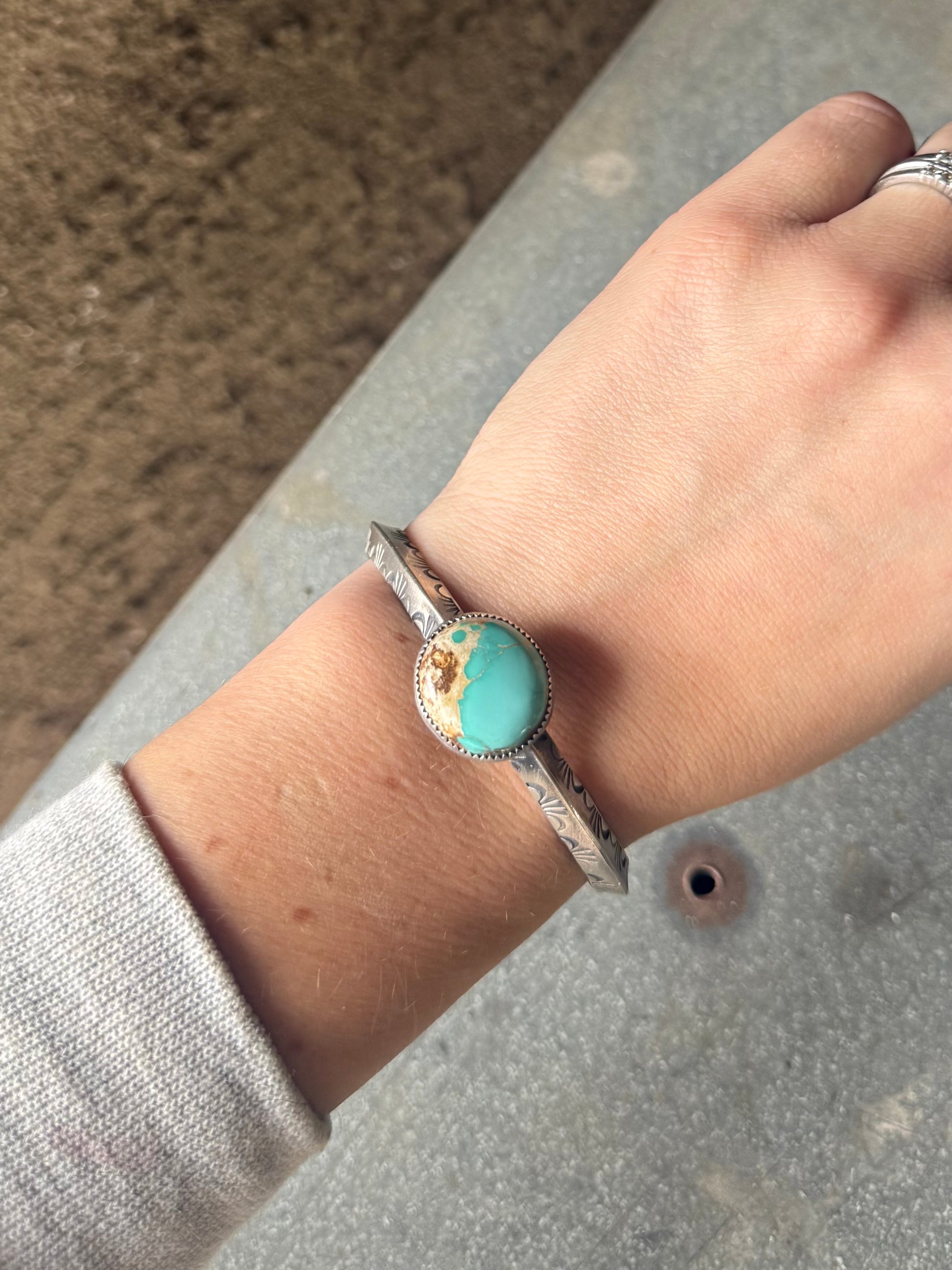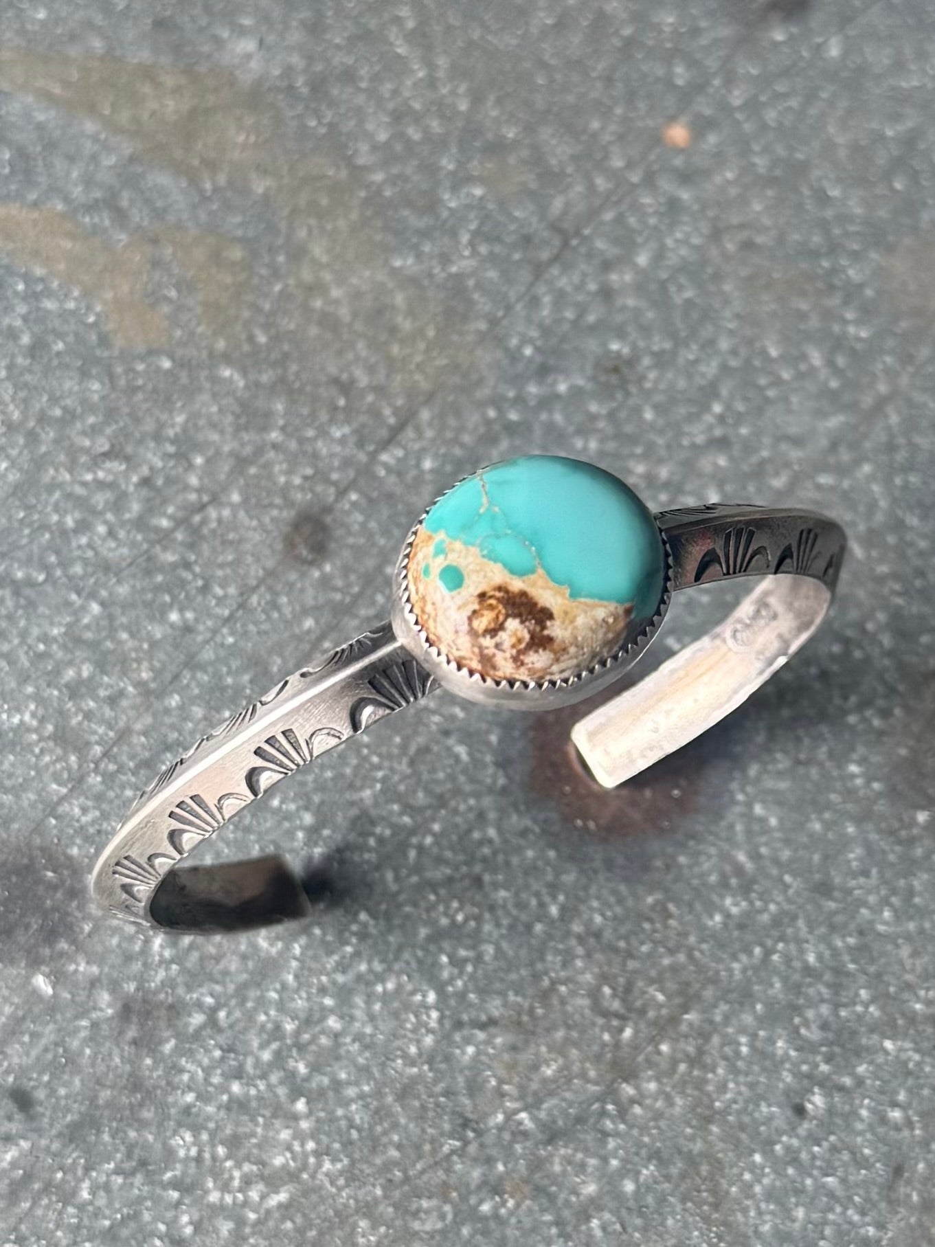 High grade royston turquoise set in fine and sterling silver on a 5.5” sterling silver band. Not measuring gap. See photos for size.