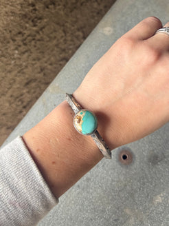 High grade royston turquoise set in fine and sterling silver on a 5.5” sterling silver band. Not measuring gap. See p...
