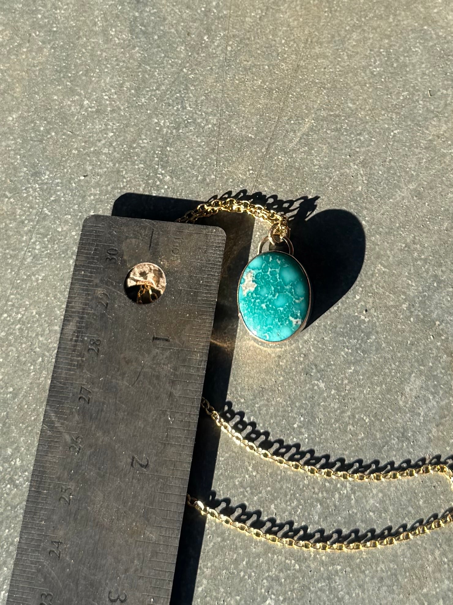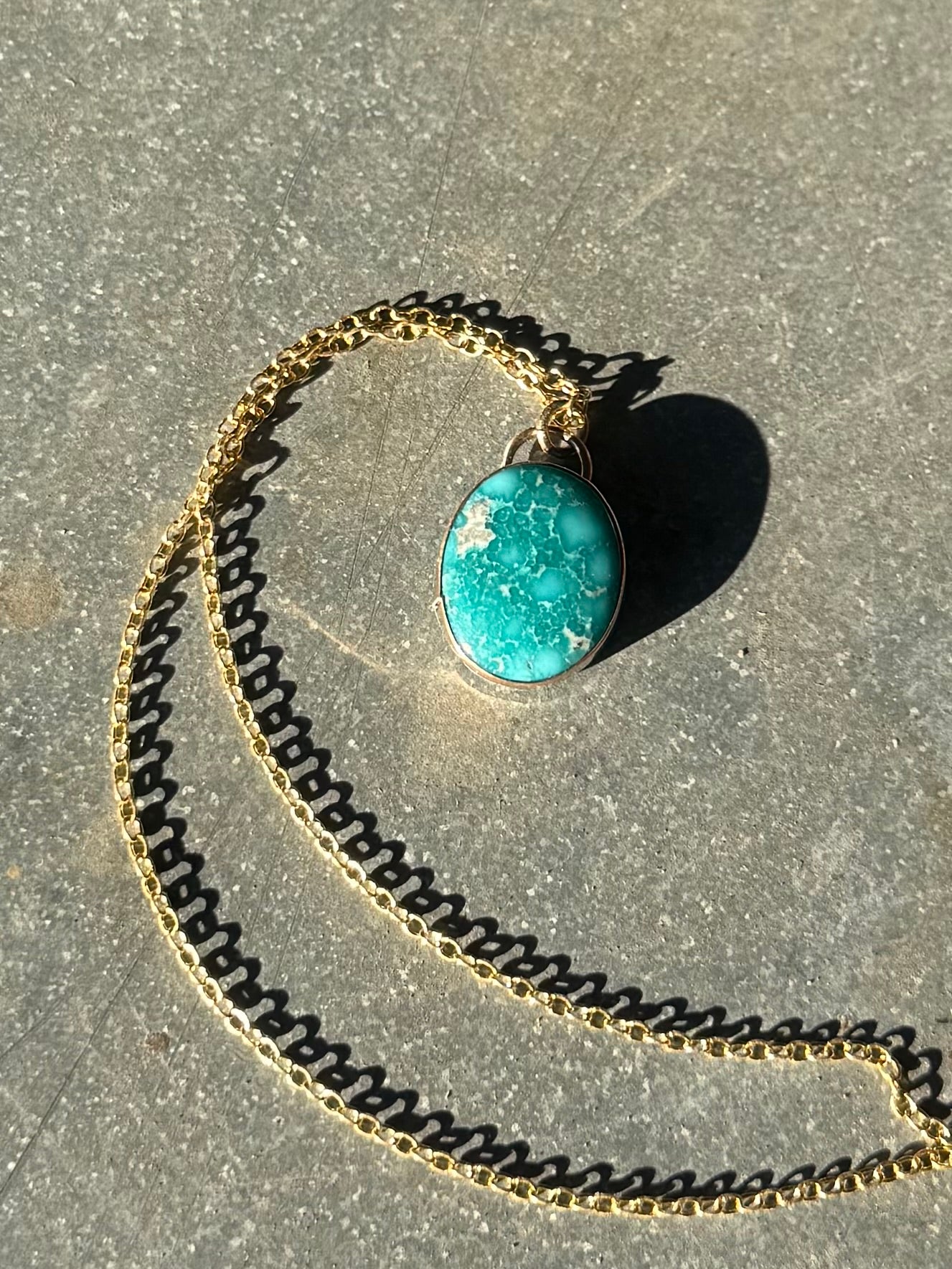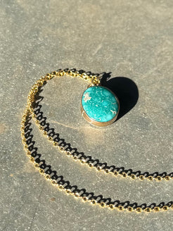 High grade white water turquoise set with a 14/20 kt yellow gold filled bezel on a sterling silver back. Comes on a dainty 16” 14/20 kt yellow gold chain. See photos for size.