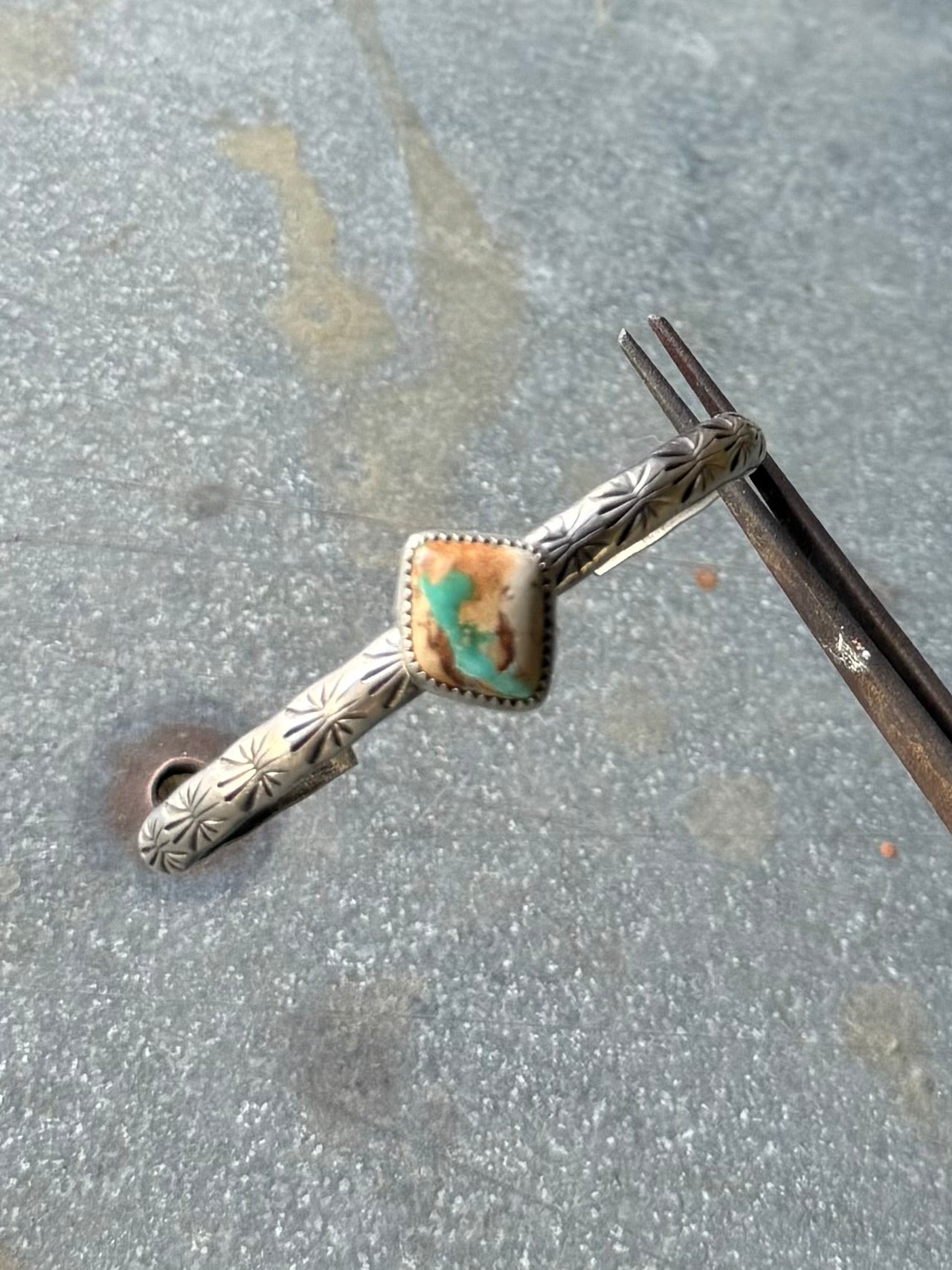 High grade royston ribbon turquoise set in fine and sterling silver. comes on a 5.5” hand stamped sterling silver band.
