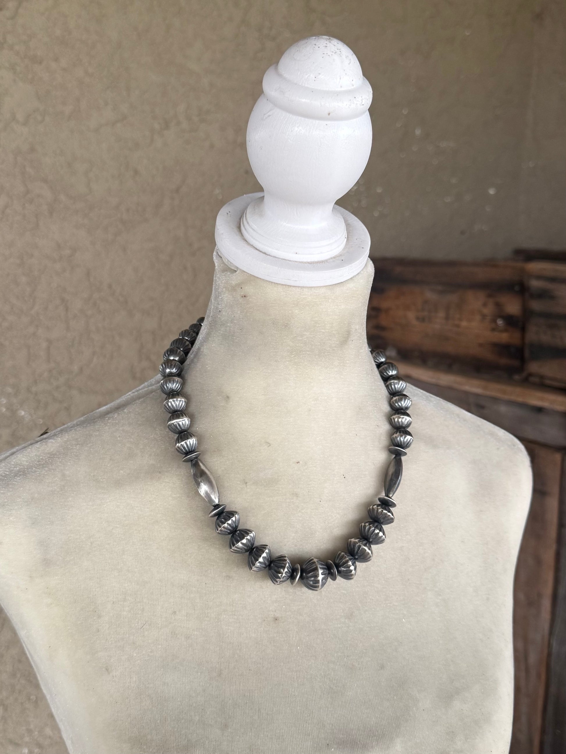 Every bead hand crafted by Virginia Tso. Navajo made. All sterling silver. 20” in length. Signed and stamped.