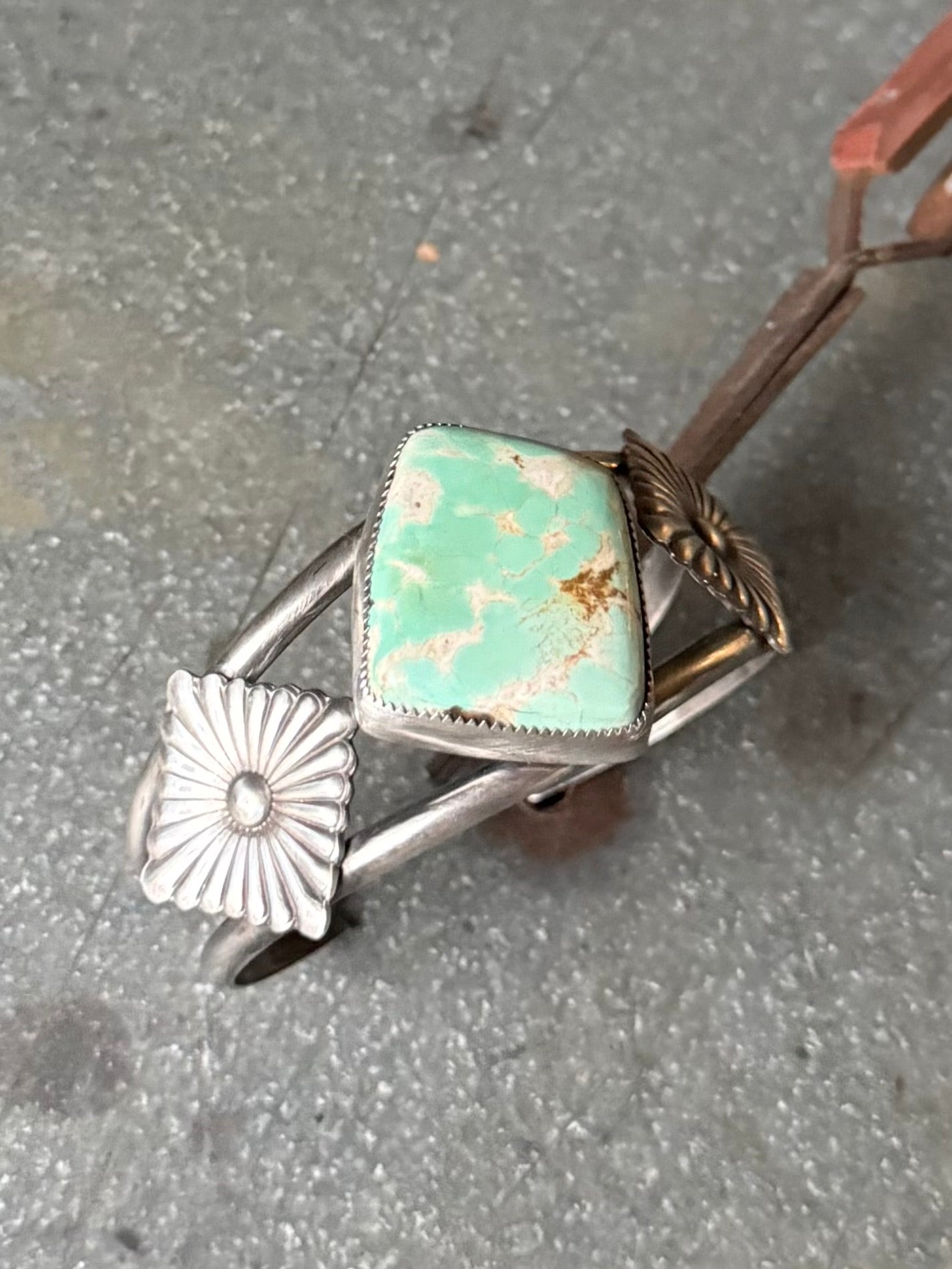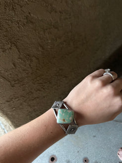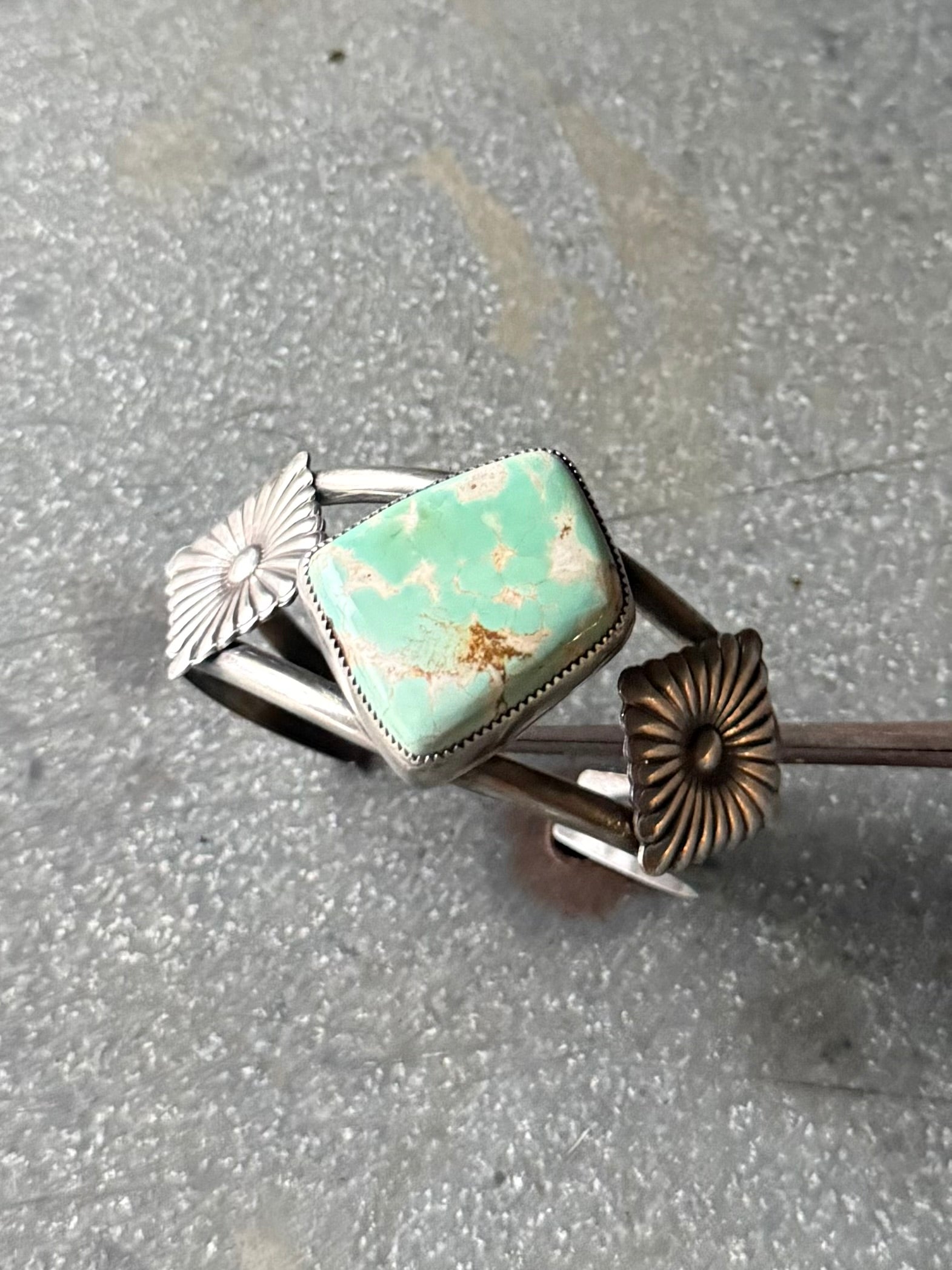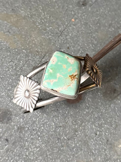 High grade minty green royston set in fine and sterling silver with hand forged sterling silver conchos on the side. Cuff is 5.5” not counting gap. See photos for size.