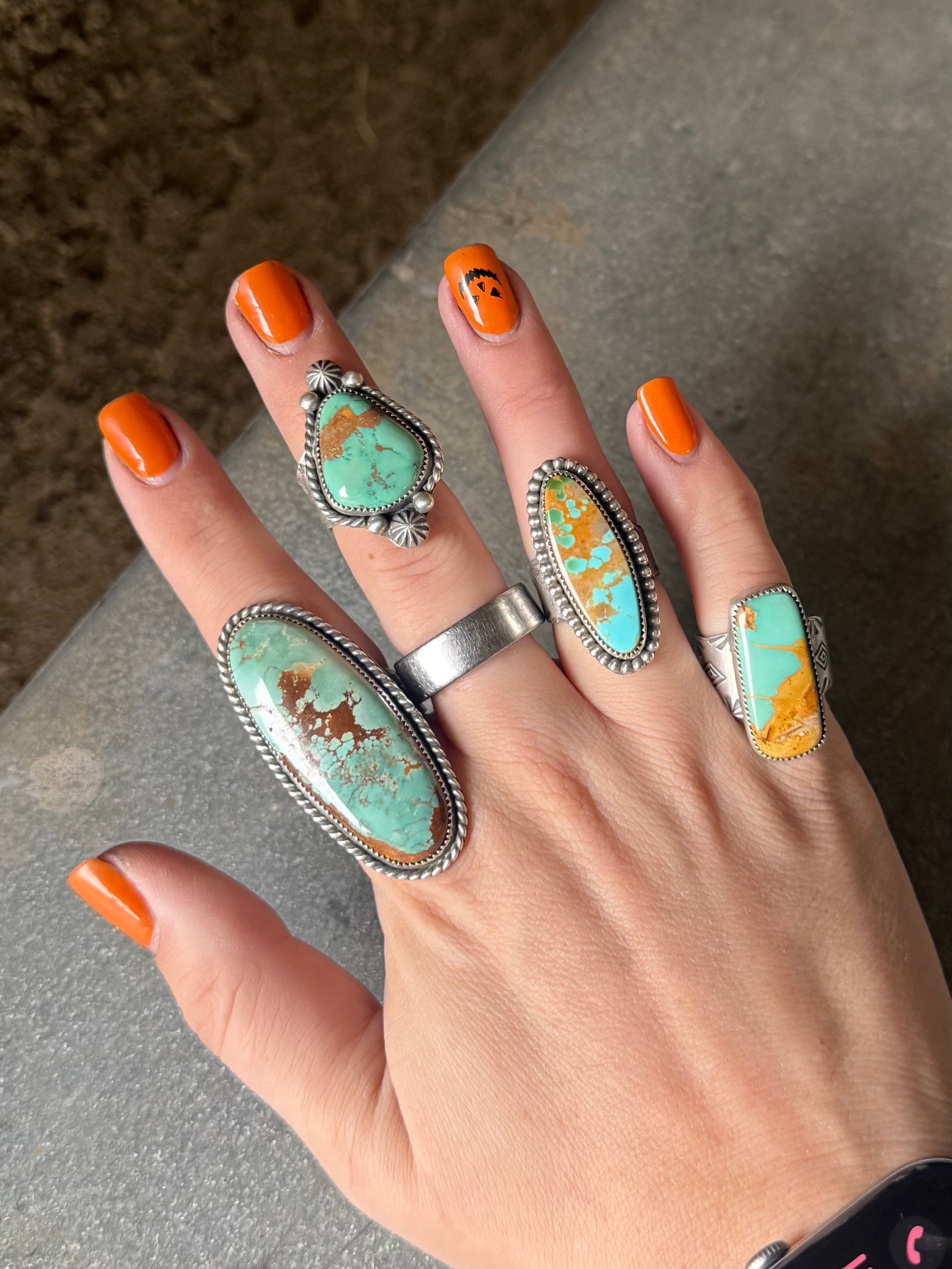 High grade Royston turquoise set in fine and sterling silver. Comes on a hand stamped sterling silver band. Size 10. Can’t be resized. See photos for size