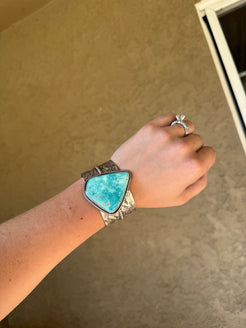 High grade large chunk of Royston turquoise set in fine and sterling silver. Placed on a 1.5” hand stamped thick sterling silver cuff band. Currently 6” without a gap included in that measurement and CAN be sized down if needed.